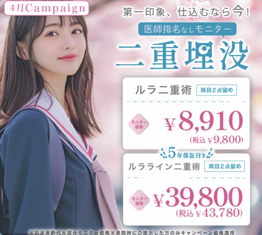 ![]() ルラ美容クリニック 千葉院 | ルラ二重術 モニター両目2点留め | 9,800円 | 詳細へ |