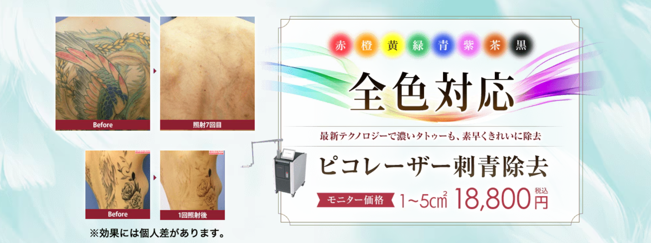 ピコレーザーによるタトゥー除去は、傷跡を残さず色素だけを破壊する最新技術です。美容外科専門医や形成外科専門医が在籍し、症例も豊富。一人ひとりに合わせた最適な照射を行っています。