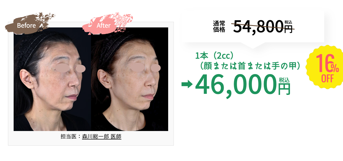 - 顔・首・手の甲いずれか 1回(1本 2cc)54,800円(税込)