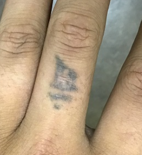 ピコレーザーを照射し色が入っている部分のインクを破壊し徐々に刺青除去