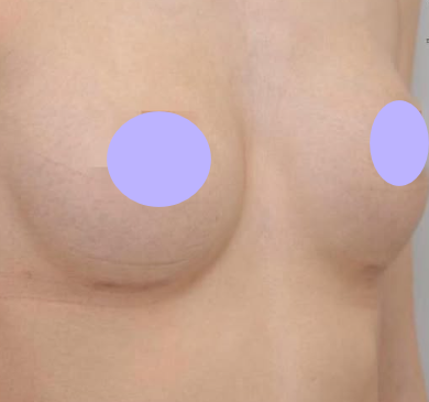 安全性が高いMotivaと呼ばれる種類のシリコンバッグを大胸筋下に挿入する。乳腺下:片胸405ccずつ