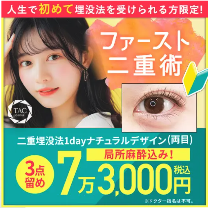 ![]() TCB東京中央美容外科 高崎院 | TCB二重術 2点留め | 29,800円(税込) | 詳細へ |