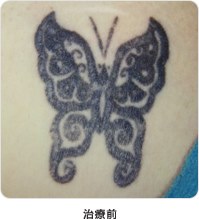 タトゥー部分にピコレーザーを照射し、瘡蓋形成をなし自然剥離してタトゥー部分を除去する施術