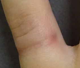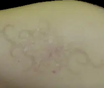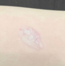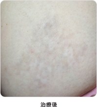 施術後より、痛み、腫れ、熱感、瘡蓋形成をなし、まれに水疱ができることがある